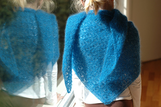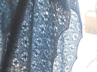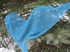 Triangular shawl with garter stitch background and all-over flower motif lace pattern.