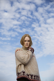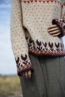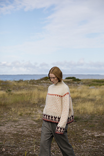 The sweater is worked seamlessly in the round from the top down, starting with an Italian cast-on and ribbed collar, then short rows to shape the upper back. The yoke is knitted in stockinette stitch before stranded colourwork is added with raglan increases. The body and sleeves are finished in dot stitch with a wide colourwork border, floats on the right side and a rolled edge.