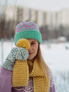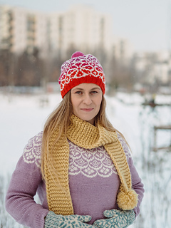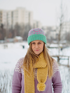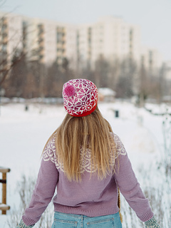 Wykonywana jest od ściągacza (lub podwójnego ronda), a następnie ozdobiona wzorem żakardowym. Wzór znajduje się na całej długości czapki, aż po jej czubek. Możesz dodać pompon, jeśli lubisz :)