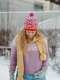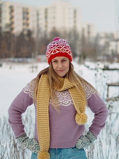 The second sample was knitted in size S/M (with a short ribbing) with Gabo Wool Kroopa Wool in the natural (0100), the Red (0137), the Raspberry Jam (0131), the Beet red (0398) and the Pink (0343) colorway