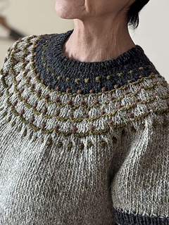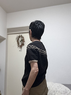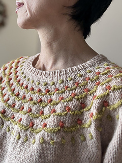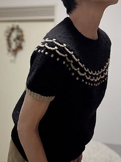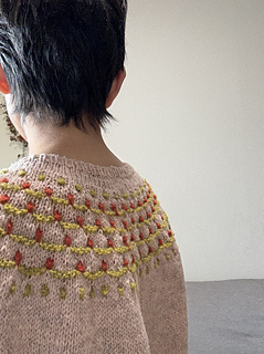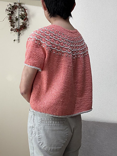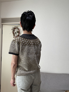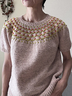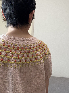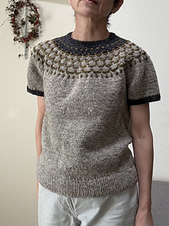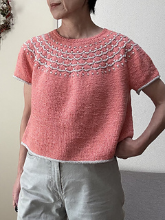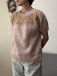 Flower Trail is a seamless short-sleeved sweater worked from top to bottom. After knitting the 1 x 1 rib, the neckline is shaped using wrap and turn short rows. While increasing stitches, the yoke’s colorwork is knitted using three colors. Since slip stitches are used, it’s easier than standard colorwork. Furthermore, combining slip stitches and purl stitches creates beautiful textured on colorwork. After completing the colorwork, work the second short rows to lengthen the back, then continue in the round until dividing for the body and sleeves. Sleeves stitches are placed on hold to work the body top down. The sleeves are worked from the top down in the round to the cuffs.