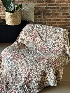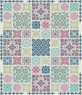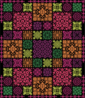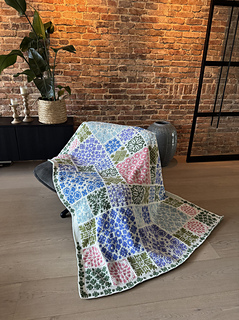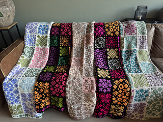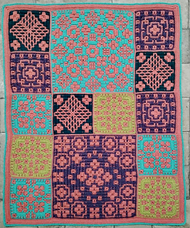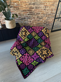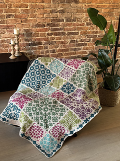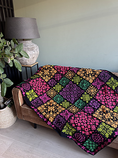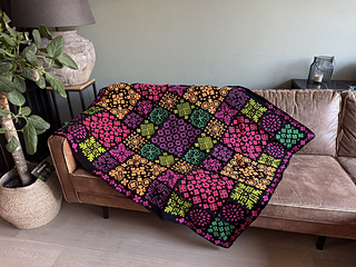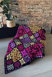 This pattern for a flowerbed blanket is made out of different squares that are joined together. The squares are crocheted in Overlay Mosaic Crochet technique from the center out.