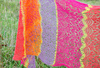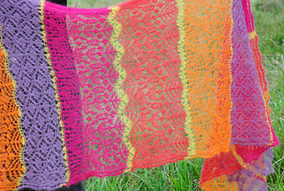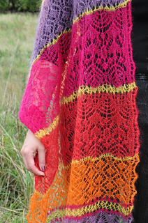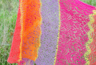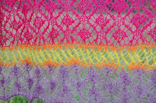 Details: Flowery Garden is inpired by the vibrant colors often seen in traditional Indian saris, where shades of red, pink, and orange are frequently combined. In my design, this lively play of colors is paired with motifs from the Scottish and Estonian lace knitting traditions, resulting in a radiant showpiece.