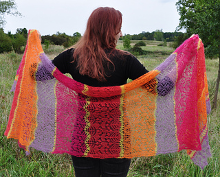 Details: Die Inspiration für den Lace-Shawl Flowery Garden stammt von den lebhaften Farben traditioneller indischer Saris, in denen Rot-, Rosa- und Orangetöne häufig miteinander kombiniert werden. In meinem Design wird diese Farbenfreude mit Motiven der schottischen und estnischen Spitzenstricktradition zu einer strahlenden Schönheit kombiniert.