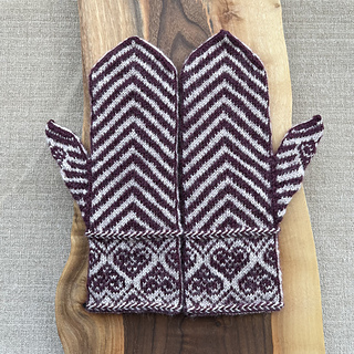 The design is suitable for two colours of fingering-weight yarn. Charts are provided for both a regular and shorter-length mitten.