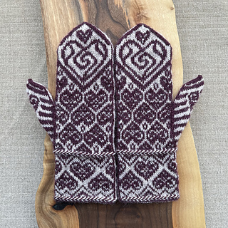 In these mittens, hearts flow from one to another with a swirling heart to top off the hand.