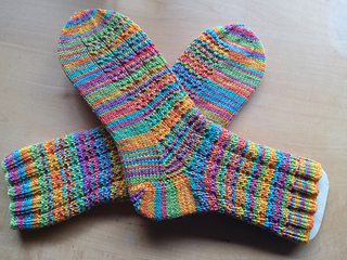 Works very well if worked with two contrasting colors but also with a self-striping yarn.