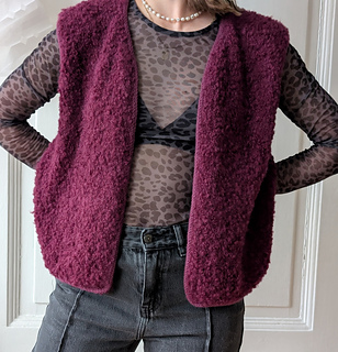 The Fluffy Fleece Vest is an oversized teddy-style vest with the look of a fleece vest. The dropped shoulders, generous positive ease, and wide armholes make it wearable over both a fitted shirt and a sweater.