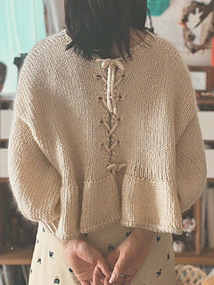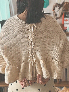 身頃と袖にはたっぷりとしたボリュームがあり, 後ろ身頃の編みあげと仕上げに施すブランケットステッチがアクセントになっています.