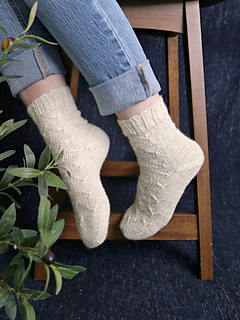 These cozy DK-weight socks are knit cuff-down, with a forethought heel and a wedge toe, including instructions for optional contrasting-coloured cuffs, heels, and toes.