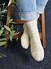 Extra-Small (Small, Medium, Large, Extra-Large)/XS (S, M, L, XL) to fit actual foot circumference 6 (7, 8, 9, 10)”/15.2 (17.8, 20.3, 22.9, 25.4) cm, measured around the ball of the foot (the widest part). Negative ease is built in to the pattern. The length and height are adjustable. If you find that you are in-between sizes, choose the smaller size if you like your socks to fit snug, or the larger size if you prefer a looser fit.