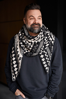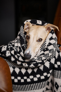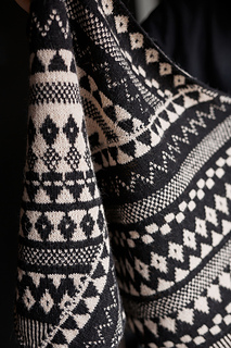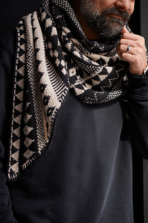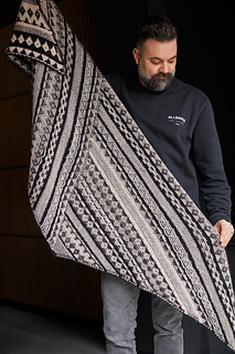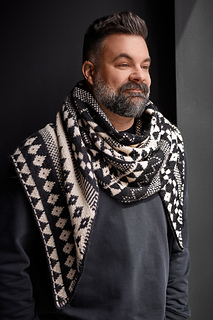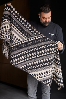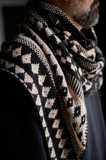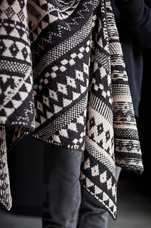The Flynn shawl features a stunning all-over motif design with bold patterns that truly shine in high-contrast colour combinations.