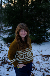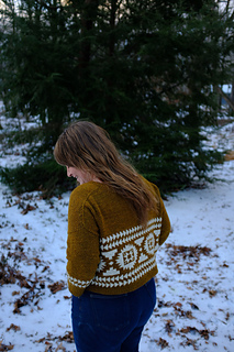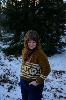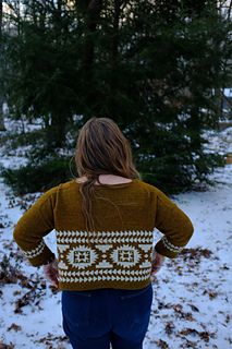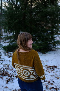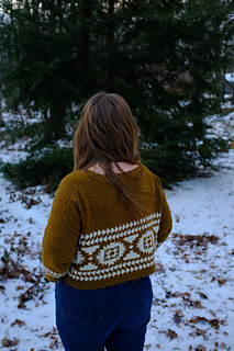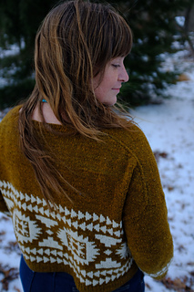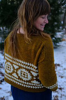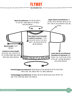 Flyway is a drop-shoulder, boxy, cropped sweater. Yum. Casting on at the back neck, it’s knit from the top down, flat, before picking up stitches at the shoulders, then knitting the front flat until you join under the arms and start your colorwork. All colorwork is knit in the round. You will pick up stitches at the armhole and knit in the round to the cuff. You will also pick up stitches at the collar to finish the neckline ribbing in the round. You will have to seam an inch or so under the arm, and you will do it fabulously.