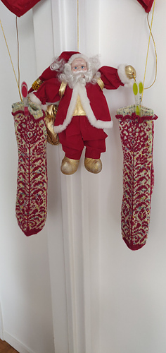 Wzorem żakardowym, na okrągło, po blokowaniu, na drutach 2,5 mm: 33 o. x 35 okr. = 10 x 10 cm.