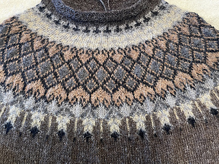 Forest at Midnight is a top down, long-sleeved pullover with gentle waist shaping that leads to a slight A-line silhouette. Fair isle patterning adorns the yoke and sleeves.