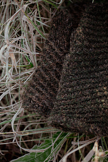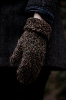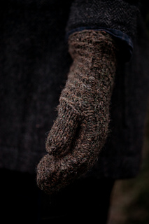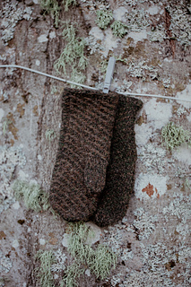 These mittens are knitted in the round from the bottom up in an all-over textured pattern and an after-thought thumb. Two strands of yarn are held together throughout the pattern and separated when making the Slip-St pattern: one of the strands is held to the front and the other to the back of the work while slipping two stitches at a time. Stitches for the thumb opening are first worked in scrap yarn, and then picked up and worked after the upper mitten is finished (afterthought thumb method). The thumb is worked in Stockinette Stitch. The mittens are finished with an applied i-cord at the bottom edge for extra stability.