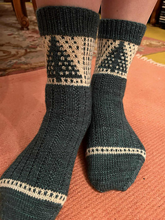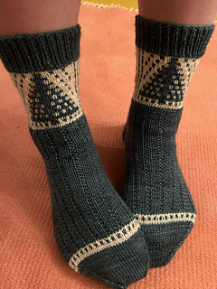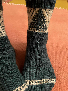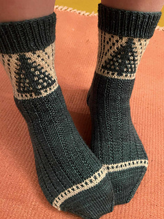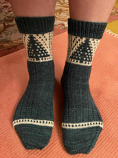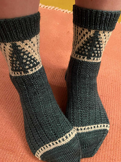 The “Forest” socks are worked cuff down with a reinforced heel, using the herringbone stitch.