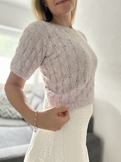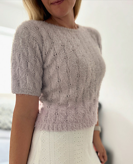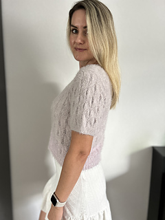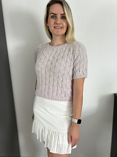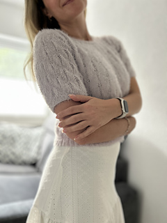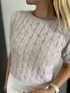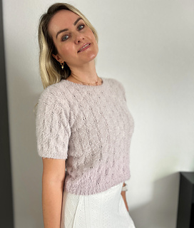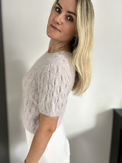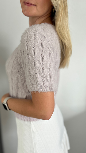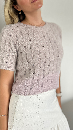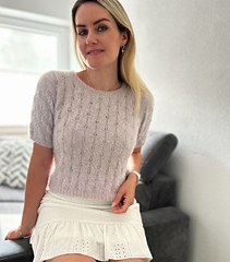 The Fortune Tee is a short-sleeved tee featuring an elegant lace pattern. It is worked from the bottom up. The body is knitted in the round to the desired length, after which the front and back are separated. The neckline is shaped on both sides, and the shoulders are finished using short rows for a smooth fit and are sewn together