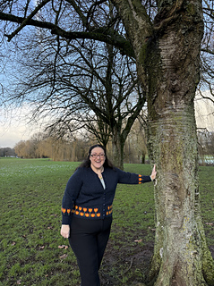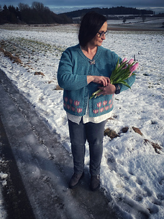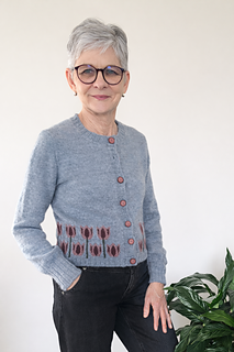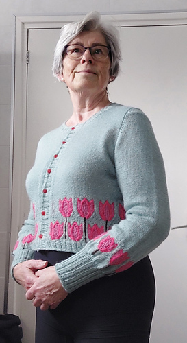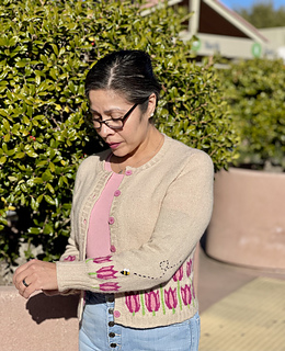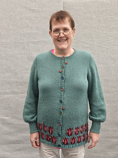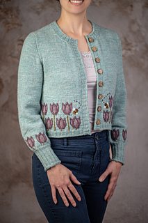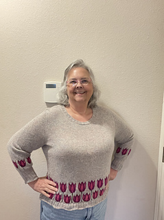 The body is knit straight until cable colorwork is worked to create the tulip motif, which ends around the high hip. Sleeves are worked from the top down using German Short Rows. Around the mid forearm, the tulip motif is worked again, followed by sharp decreases to a fitted 4” (10.2cm) cuff.