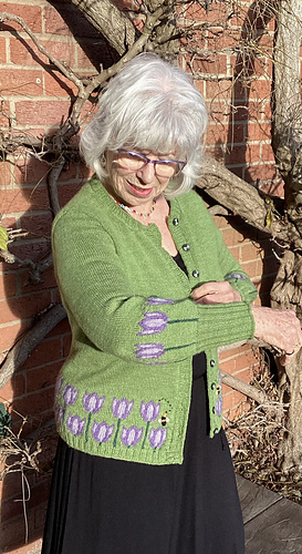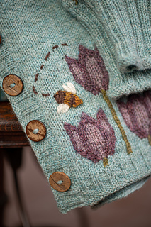 At this point, the cardigan is blocked and steeked. The collar may be picked up and worked anytime after the completion of the upper body, but should be completed before button bands are added. If tulip stems were not knit in pattern, they are duplicate stitched onto the sweater. One or more applique bees may be created and sewn to the cardigan for embellishment.