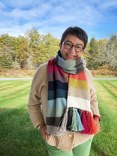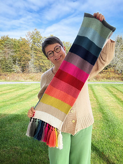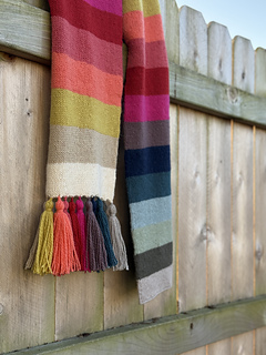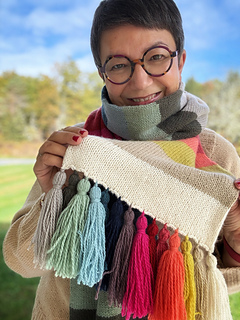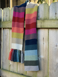 Weave in the ends as you go by anchoring the tail of the next color over 8 stitches before the color change and then anchor the tail of the previous color over first 8 stitches of the new color. Both ends are then bound off using a 3 needle bind off. There is enough yarn left over for tassels if you choose to complete the look.