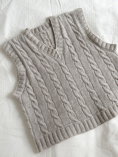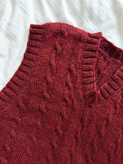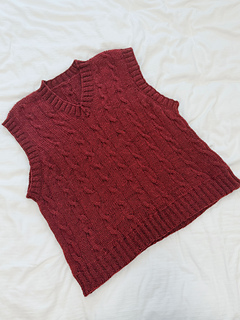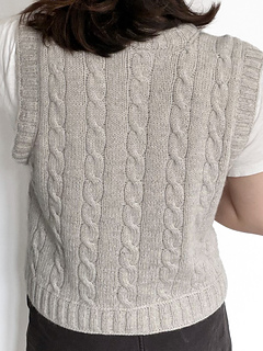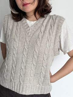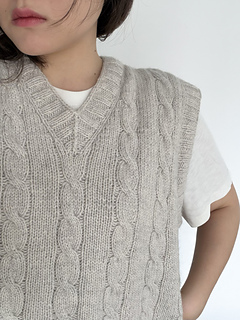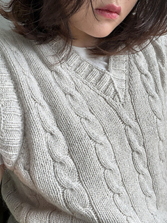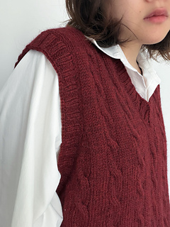 This vest features a classic cable-and-rib texture with a V-neck silhouette. It is worked top-down, beginning with the back panel. Stitches for the shoulders are picked up and worked separately. The V-neck and armholes are shaped simultaneously with increases. The front and back are then joined to work in the round. Finally, the neckline and armholes are finished with double ribbing.