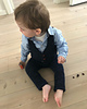 The waistcoat is worked from the waist upwards as a single piece. The shoulders are shaped with short rows and then joined with a 3-needle bind off. The trousers are worked from the top down with an elasticated waistband. The waistband and leg edges are decorated in seed stitch.