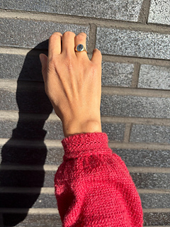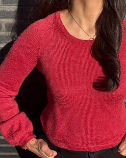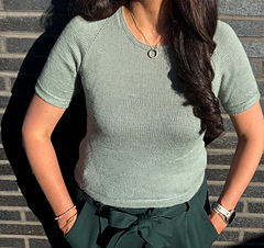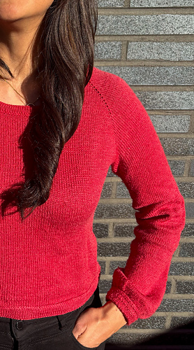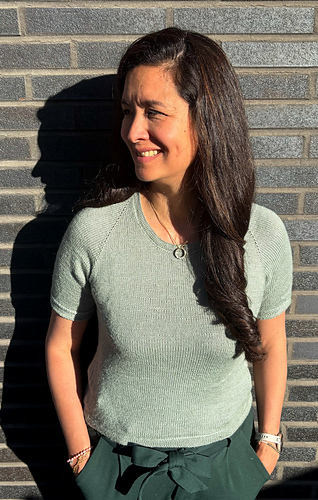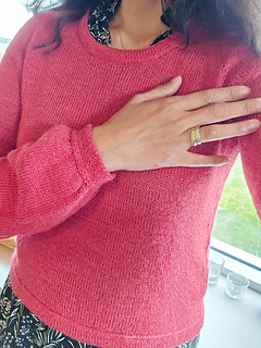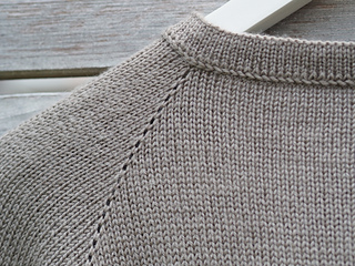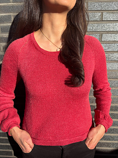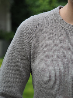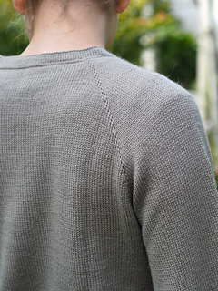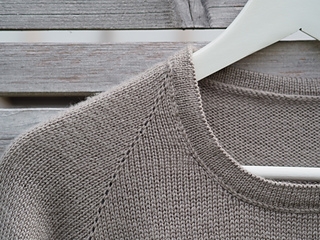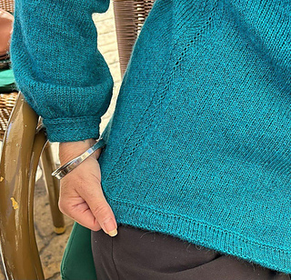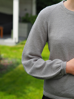 The Frederiksberg Blouse has a feminine, elegant and timeless style. It is knitted top down and in rounds. First, the neckline and yoke are knitted in back and forth rows and shaped with increases. A decorative eyelet chain runs along the raglan line. Only then is the piece closed in rounds. An eyelet band is worked on both sides of the body. The sleeve cuffs also have an eyelet band. The torso is separated from the hem with lateral braid stitches and the hem is folded at the end. Then stiches are picked along the round neckline, knitted also with lateral braid stitches, folded and bound off. The instructions include explanatory videos for better understanding.