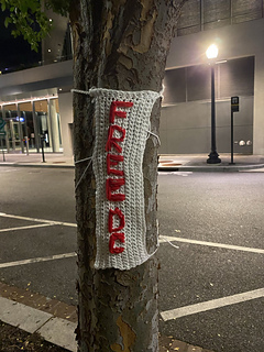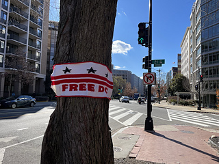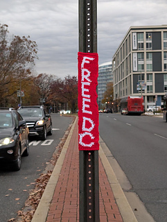 Welcome to the FreeDC Yarn Bomb Community, started by Washington-based activists postering, messaging, demonstrating, and now, using textile signage to let everyone in the capital know Free DC’s message: