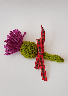 The brooch is knitted flat on two needles and uses simple shaping to create the thistle’s distinctive form: a bold purple bloom, a cup-like green base, and a neat stalk. It’s a great stash-buster and ideal for knitters of all levels, including beginners looking for a satisfying, speedy make.