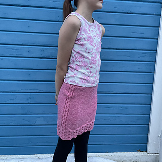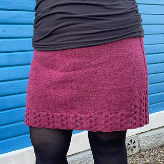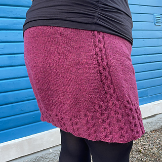 Den här kjolen stickas uppifrån och ner. Längst upp gömmer sig ett instickat resårband. Sidorna på kjolen pryds av ett flätmönster vilket också återkommer i kjolens nederkant.