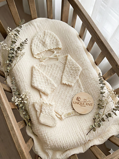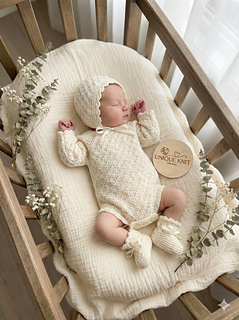 A pretty unisex romper with a matching bonnet and booties. Knitted on straight needles back and forth with line-by-line instructions.