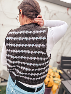 You begin with the back piece. After shaping the shoulders using short rows, work in rows until the increases for the armholes are complete. Then place the stitches on hold. Next, pick up stitches along the cast-on edge of the back piece to work the front pieces one at a time. Shape the neckline with increases, and work in rows until the armhole increases are complete. When all pieces are ready, join them together with the new cast on stitches and continue working the body in rows. Continue the neckline increases for a few more rows. The body of the vest is finished in rows. Finally, pick up stitches along the armhole edges and along the front bands of the vest to finish the edges neatly.
