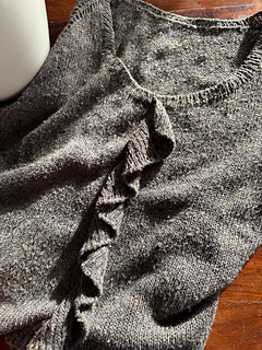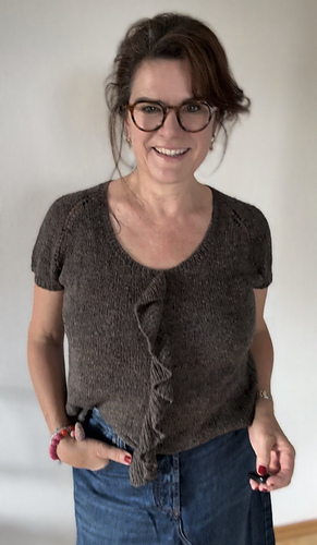 Ich habe ein Faible für Rüschen! Sie verwandeln ein schlichtes Basic in etwas Spielerisches und Feminines. FRILLS FOREVER Shirt ist ein luftiges Raglan-Shirt, das von oben nach unten gestrickt wird, mit kurzen angeschnittenen Ärmeln und einem Volant-Detail auf dem Vorderteil.