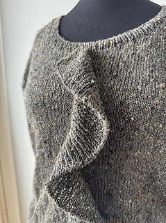 Nadeln: 3,5 mm / US 4 80 cm / 32” für Bündchen (Ärmel / Saumbündchen), 4,0 mm / US 6 in 80 cm / 32” für Körper, Ärmel und den Volant. Oder die Stärke, mit der du die Maschenprobe erreichst.