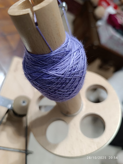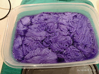 This perfectly matches this sweater knitted in the round with a fingering merino that I hand‑dyed at home using Jacquard Lilac pigments.