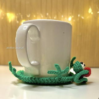 I explain step by step how to make the cute frog knitted coaster holding the cup.