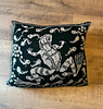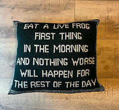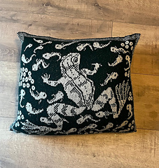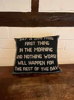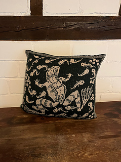 A stranded cover for a 50x50 cm (20x20 inch) cushion, with an elaborate frog and tadpole motif on the front and an “Easter egg” quote on the reverse.
