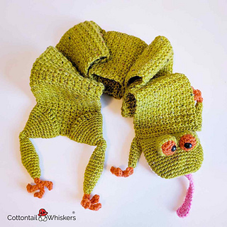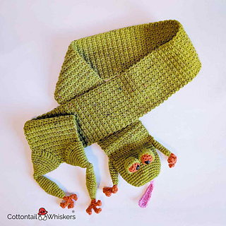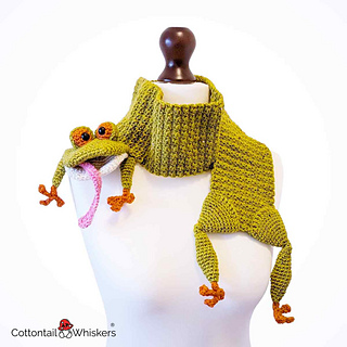 Our Frog scarf crochet pattern. Create our amorphous frog, newt or crocheted toad neck warmer depending on what you’d prefer to make it as. Many pages of photo tutorial guide notes and ‘how-to’ explanation from Cottontail & Whiskers. Add this crochet frog scarf pattern to keep, view, download and print whenever you need.