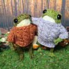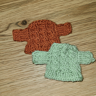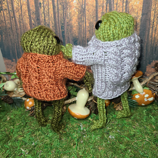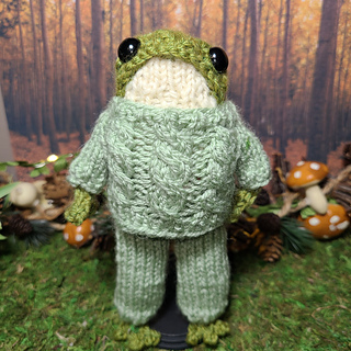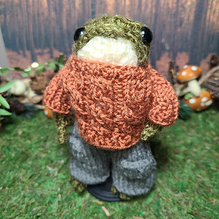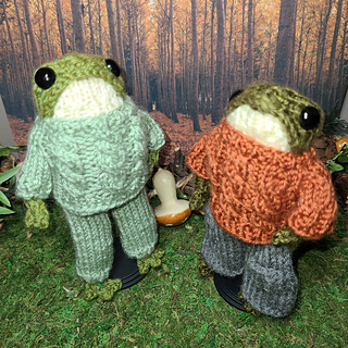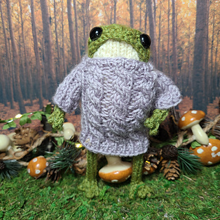 A gorgeous pullover for your dotpebble’s frog featuring a cable design on the front and back. Knit in the round primarily, with ribbed edges and minimal seaming. Pullover is knit top down, and can lengthened into a cable sweater dress if desired. Perfect for Froggy’s autumnal wardrobe.
