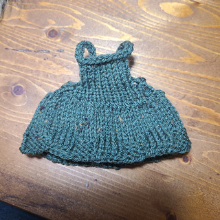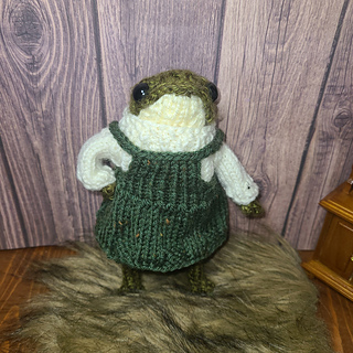 A tiny pinafore dress designed to fit dotpebble’s knitted frog. Features a ribbed edges, flared skirt, and looped straps for easy dressing. Perfect for tweedy yarns and woodland adventures. Pattern includes written instructions and photos.