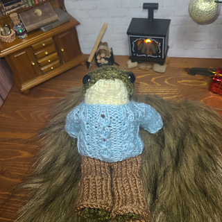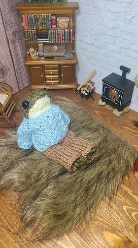 Scared of cables? This pullover for your dotpebble’s frog has that cozy cable feel and look without actually using them! Knit in the round for minimal seaming, this pullover features a collar that transitions into the mock cable design, and shaped with increases to create the sleeves. Perfect for snuggling up by the fire on cold winter nights. Written instructions and photos included.