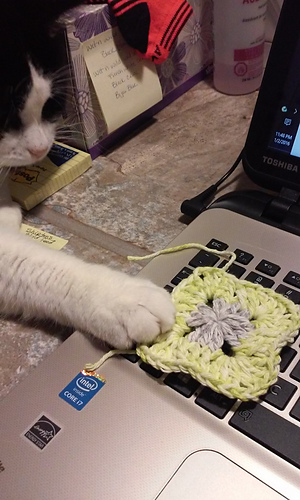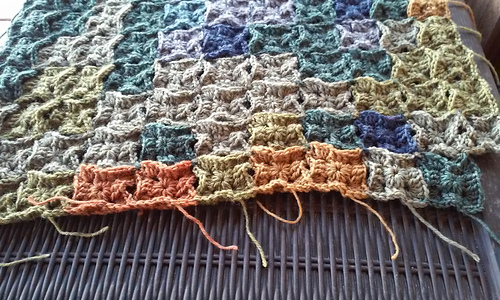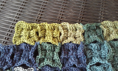 This is a textured small, granny square that is best done not in a cotton yarn. Cotton can be used but in my samples it showed the least amount of texture (see the grey/lime square in the photos).