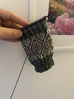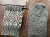Frost Heart, a mitten, a sister/brother to Frostheart sock with a lovely multi-color knit with a gray base and touches of white and pink in a rather soft, almost diamond/frost-like pattern. Names can often reflect a feeling, the colors or the shape of the pattern.