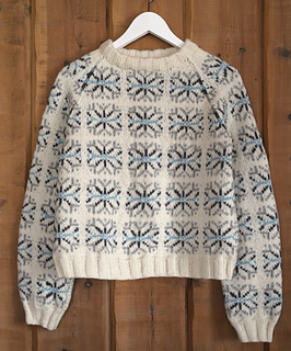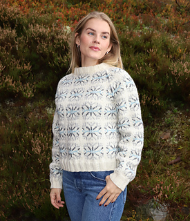 Despite its frosty colourwork pattern, Frostrose is warm and cosy to wear. The sweater is worked from the bottom up with a repeating pattern that is easy to memorise and enjoyable to knit. Garter stitch is worked at the sides of the body and under the sleeves, while the yoke is shaped with raglan decreases. You can choose between a short or a high neck. The length can easily be adjusted by adding or omitting one or two Frostrose repeats.