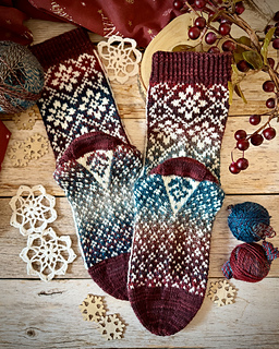 Die “Frost Blumen Socken” werden vom Bündchen abwärts gestrickt. Sie haben verstärkte Käppchenfersen und können zweifarbig oder mit kontrastfarbenen Bündchen, Fersen und Spitzen gestrickt werden.