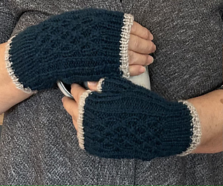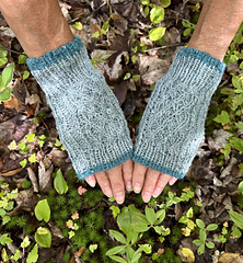 These mitts are worked bottom up in the round. They are cast on and bound off in 1/1 ribbing using the tubular method for knitting in the round. The cables and ribbing pattern of the hands has a cable design on the mitt front, a textured rib design on the underside, and a defining rib on either side. The right hand mirrors the left hand, with the cables on each hand slanting toward the other when the mitts are held together. The thumbs are designed without a gusset. Stitches for the thumb opening are put on hold, then picked up and worked in the round once the hand is completed.