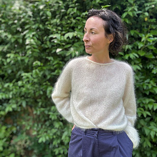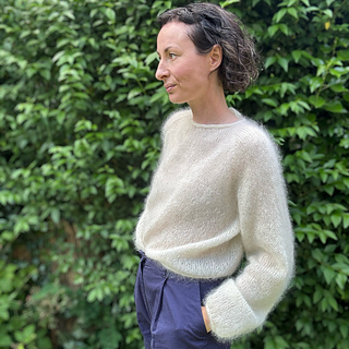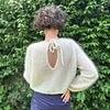 ’Fuzzy Galore’ is an elegant and airy raglan sweater worked top down. It features a keyhole opening with i-cord ties behind the neck. Short rows and columns are worked on both sides of the slit to achieve a flattering fit. It has a cropped length with long, airy balloon sleeves and I-cord edges finishing the body, sleeves, and neckline. It is an obvious choice for festive occasions, and with a t-shirt underneath, it transforms perfectly into everyday wear. See ‘Fuzzy Galore’ demonstratedhere.