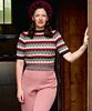 The original Copley’s pattern suggests five colours, with the ribbed edgings of cuffs and neckband in a darker contrast that isn’t used in the main pattern. The finished model has used just four colours, working the darker edging contrast into the main pattern to bring out the colours of each stripe and tie the whole together.