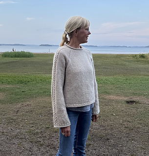 Tröja som är mysig och värmande året runt. Stickas uppifrån och ner med ”rullhals” och några förkortade varv för att forma halsringningen. Tre flätor löper längs med ärmarna och raglansömmarna består av omvänd slätstickning.